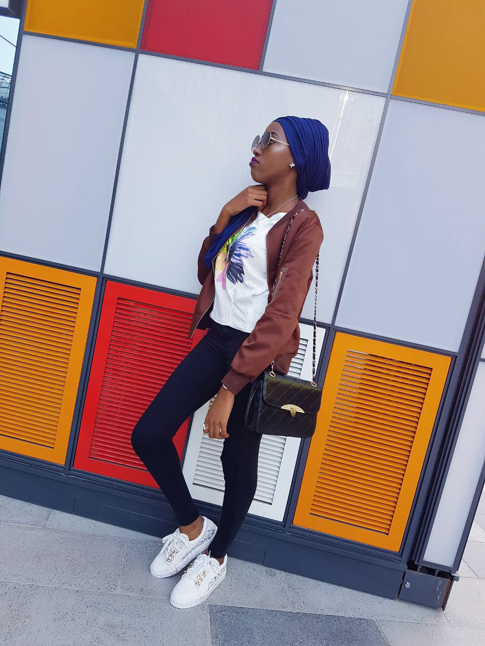 My boo Zainab decided to be a more colorful with her look. I love the casual chic vibe she's giving. She paired a crop top with a brown bomber jacket, black pants and dope a** sneaks.